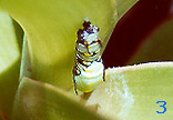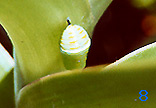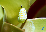 | 2. Aufgehängte Raupe kurz vor der Verpuppung. Sie ist bereits dicker geworden u.die vorher weißen Ringel scheinen nun hellgrün |